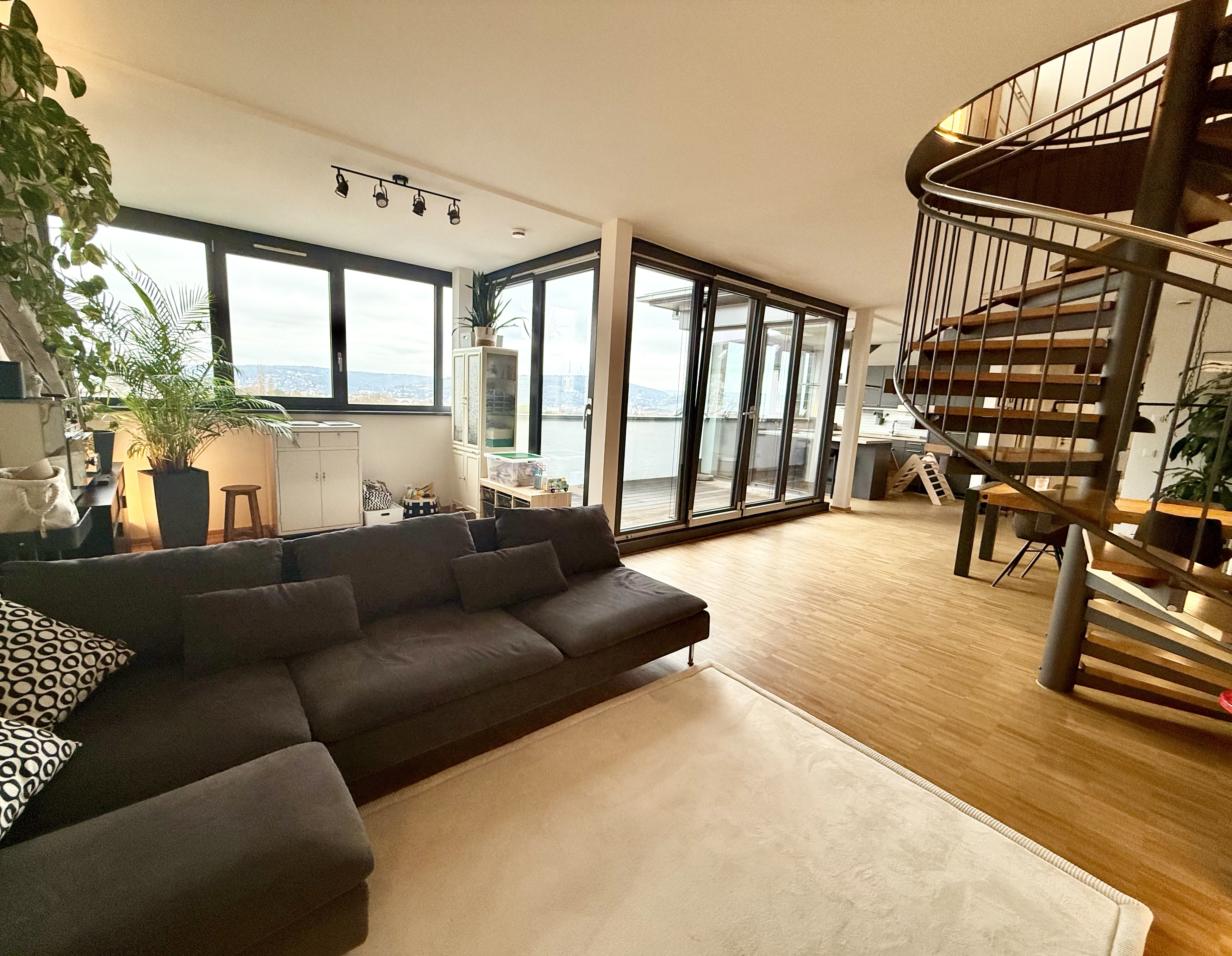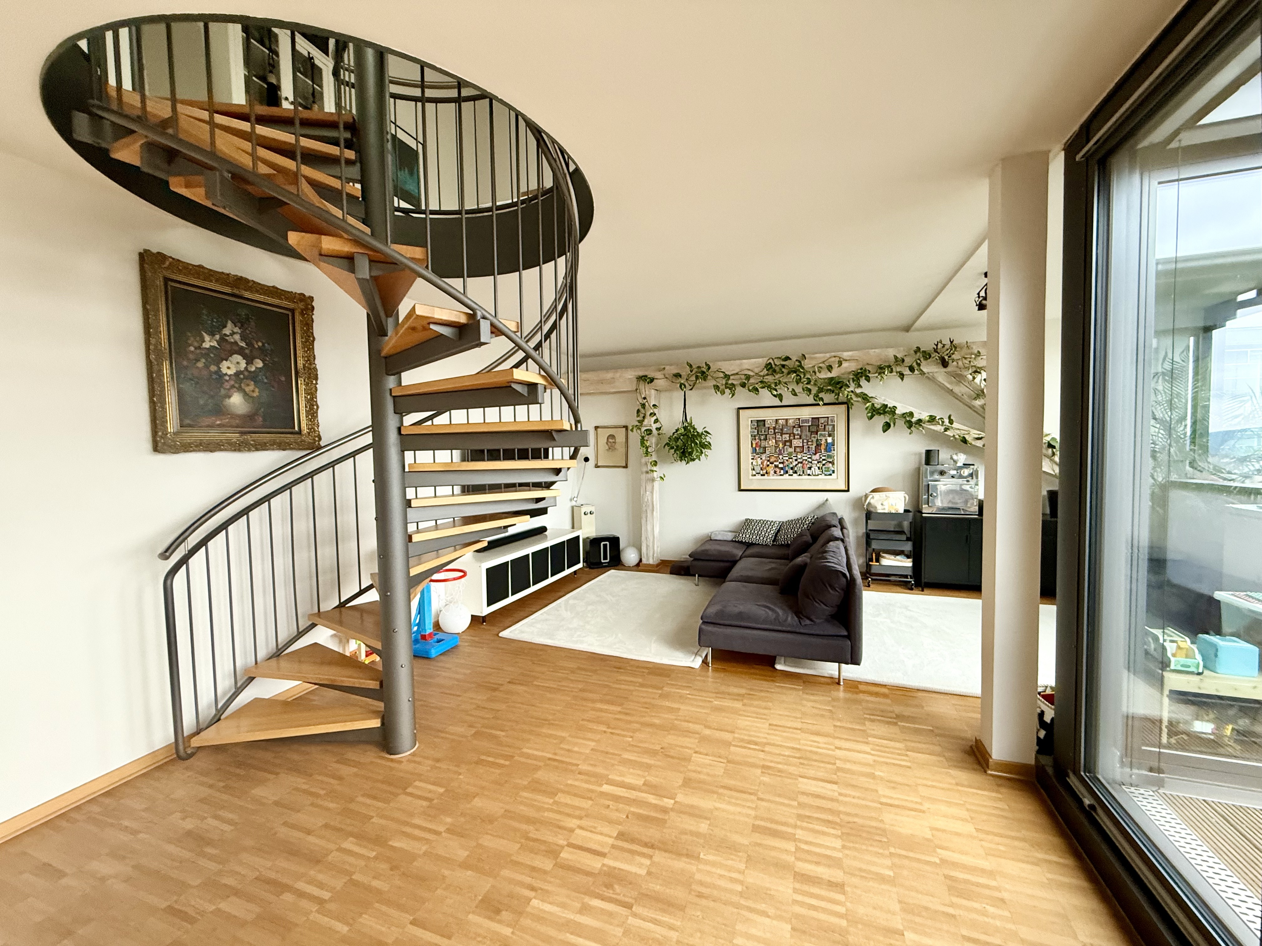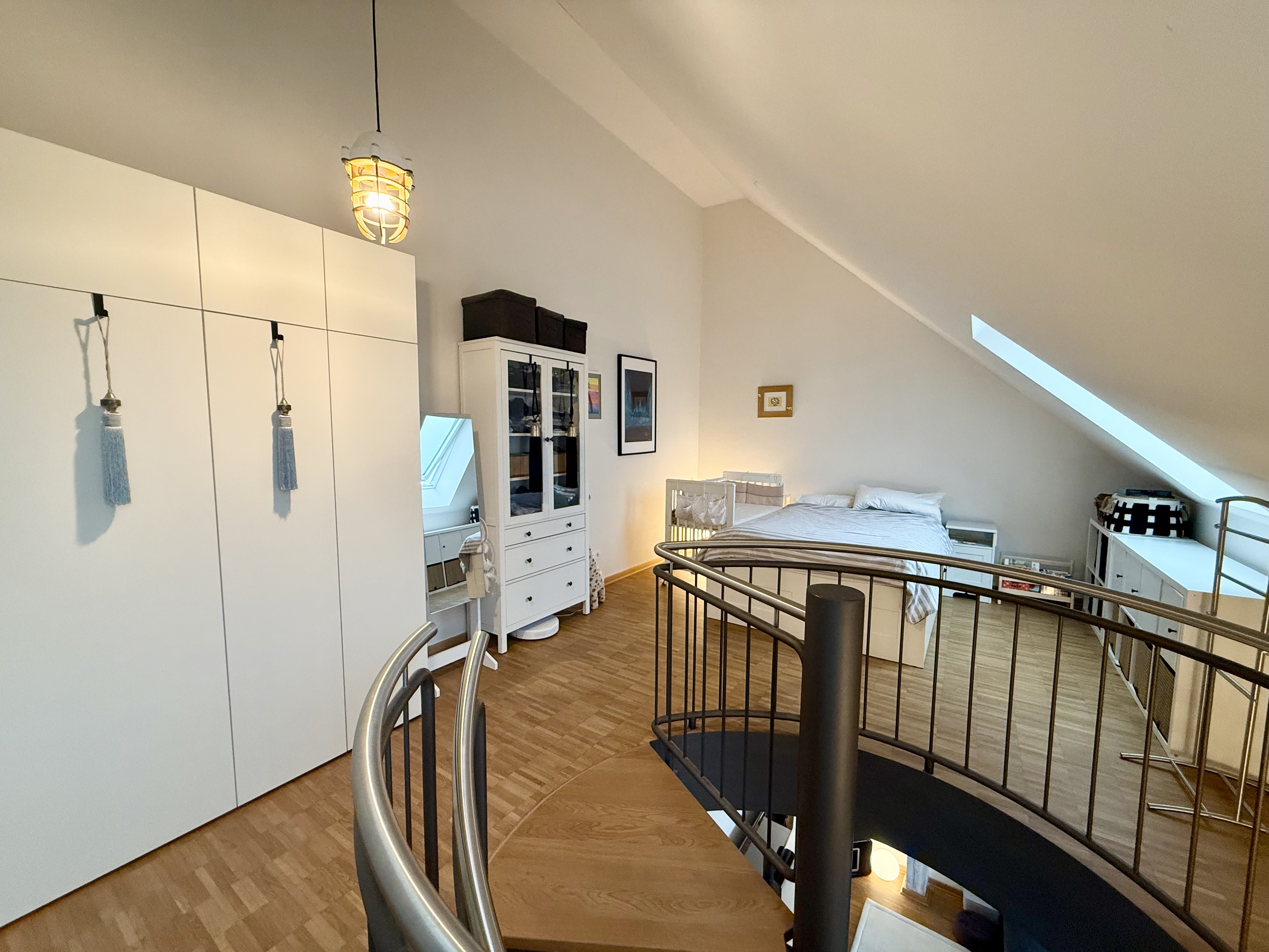 Die Wohnung erstreckt sich über zwei Ebenen im Dachgeschoss. Im ersten Dachgeschoss befindet sich ein offen gestalteter Eingangsbereich, von dem aus sowohl der großzügige Hauswirtschaftsraum mit Waschmaschinenanschluss als auch das innenliegende Gäste-WC erreichbar sind. Herzstück dieser Ebene ist der lichtdurchflutete, offen geschnittene Wohn-, Ess- und Küchenbereich mit großer Fensterfront und direktem Zugang zur traumhaften Süd-West-Dachloggia mit wunderschönem Blick über Würzburg. Eine Wendeltreppe führt in das zweite Dachgeschoss. Dort erwartet Sie ein offener Schlaf- bzw. Ankleidebereich sowie ein Tageslichtbadezimmer, das mit Badewanne und Dusche ausgestattet ist.